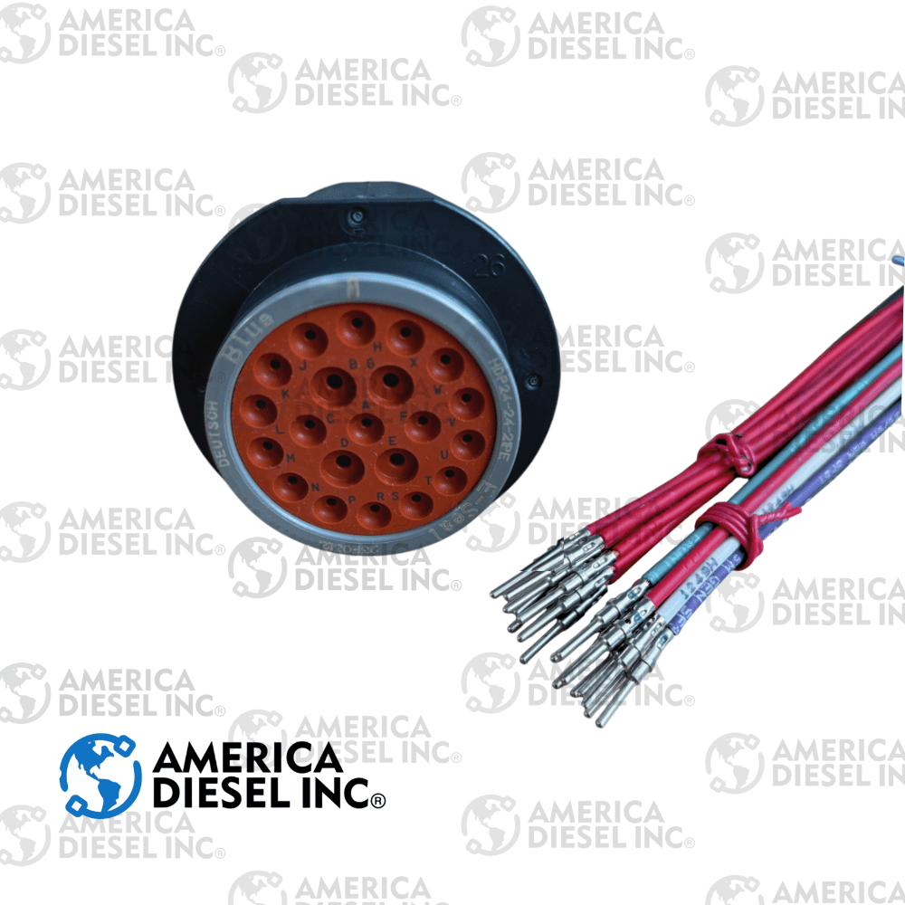 Conector 21 vías Pin ensamblado con terminales Cal. 18,12 de la marca Deutsch. Cuenta con 25 cm de cable tipo GXL conforme SAE J1128 retardante a la flama. Cal. 18,12